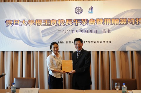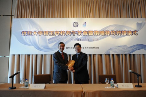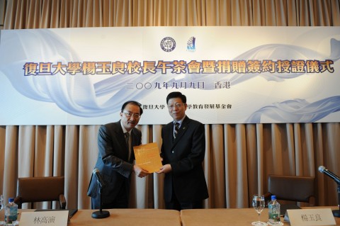 2009年9月9日下午,由复旦大学与复旦大学教育发展基金会(海外)主办的杨玉良校长午茶会暨捐赠签约授证仪式在香港四季酒店成功举行。出席活动的来宾包括杨玉良校长、李达三校董、陈曾焘校董、吕志和校董、蒋震校董、谢仕荣校董、杨紫芝校董、袁天凡校董、姚祖辉校董、刘浩清校董代表刘铁成先生、滕一龙校董代表钱世政先生、复旦大学教育发展基金会(海外)林高演董事、陈仲儿董事、复旦管理学奖励基金会李灵修理事、复旦大学香港校友会现任会长徐志新先生、前任会长梁在辉先生、原上海医科大学校友会副会长岑国仁、香港校友会汪新芽等理事、校友代表出席了活动。校长助理、外事处处长陈寅章、对外联络与发展处处长张宏莲、政策研究室主任刘承功等复旦大学来宾一同出席。此次活动是杨玉良校长上任后首次访问香港所举行的面向校董、理事、校友的集体活动。活动得到了姚祖辉校董的特别支持。