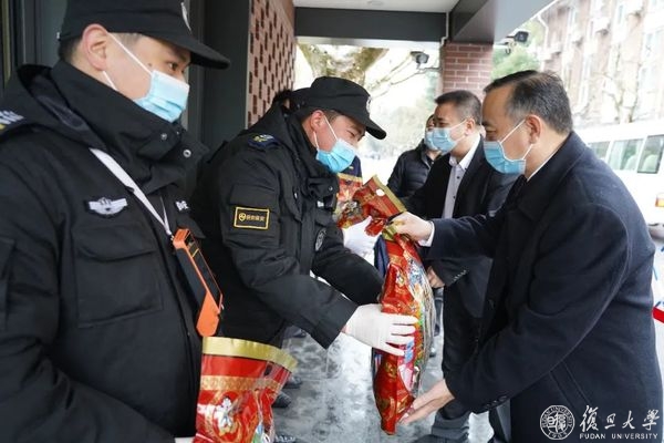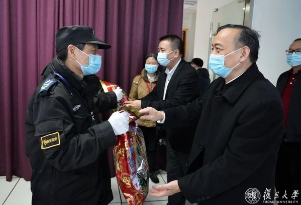 2月11日,除夕,枫林园内小雨淅沥,静谧祥和。上午十点,复旦大学党委副书记、上海医学院党委书记袁正宏,复旦大学常务副校长、上海医学院党委副书记、院长金力,复旦大学上海医学院党委副书记、副院长徐军一行来到东安路校门、护理学院、放射医学研究所、西六号楼、枫林一楼食堂等处,看望慰问春节期间值守一线的安保、餐饮、物业、绿化和门诊部等工作人员。