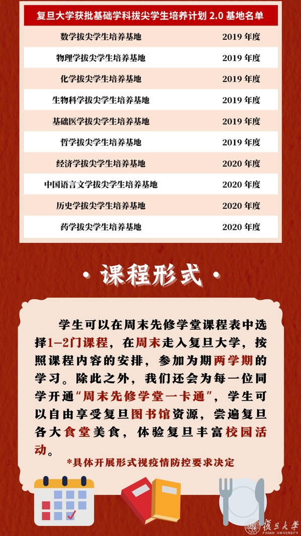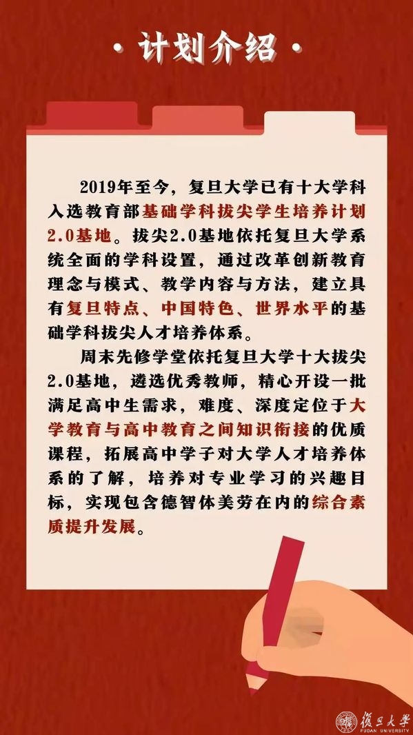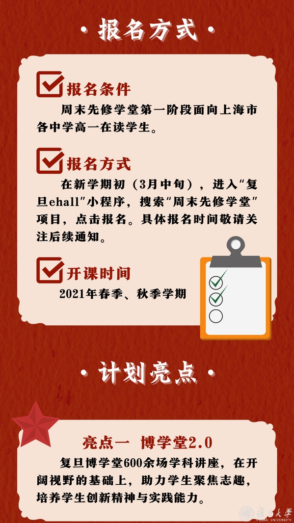 在三月中旬,复旦大学将开放周末先修学堂报名系统,各位高中生可关注复旦大学、复旦招生官方微信公众号,及时获悉报名的相关通知。