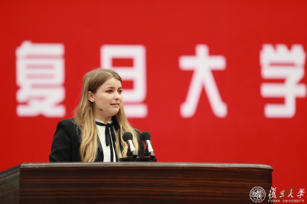 新闻学院2021级博士生爱琳作为留学生代表发言。爱琳来自摩尔多瓦,她从小就有来中国求学的愿望,为此她克服了语言关、生活关、文化关等困难,一步步实现了她的梦想。来到复旦,她希望在学业上继续深造,在实践中尝试相关的营销和传播工作,投身传播可持续、绿色的管理和营销的理念中,为建设“人类命运共同体”贡献自己的力量。