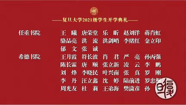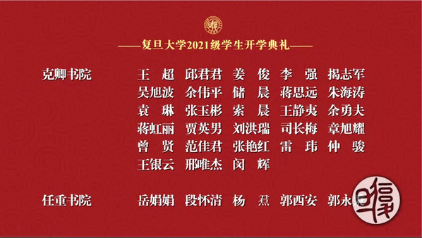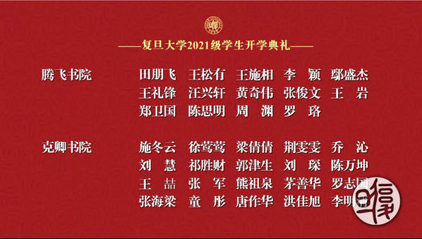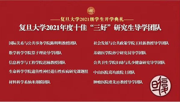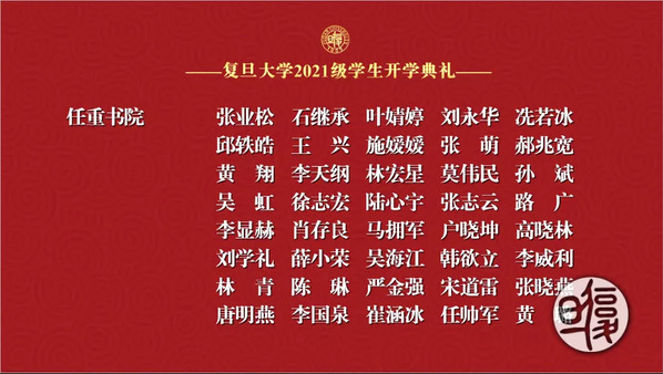 副校长张人禾宣读十佳“三好”导学团队获奖项名单,新生代表为2021年研究生十佳“三好”导学团队获得者献花。优秀榜样的力量,在新生进入复旦的第一刻便激励着新一代的复旦人们,不断进取,勇攀高峰。