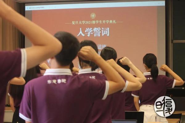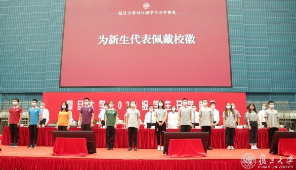 鉴于疫情防控常态化要求,复旦大学本次采用线上线下相结合的方式欢迎新同学。本科生和研究生代表约2400人在正大体育馆现场参与典礼,其余新生在分会场观看直播。
