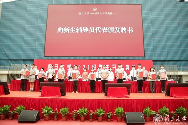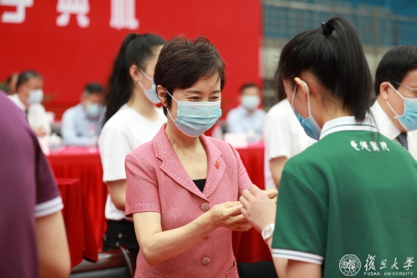 主席台校领导和老师为新生代表佩戴校徽,勉励他们努力学习,刻苦钻研。校徽戴在胸前,责任牢记心间。复旦的精神,复旦人的使命,在新生的心中生根发芽。