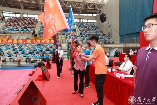 校党委书记焦扬为来自五大书院的新生代表授书院旗。