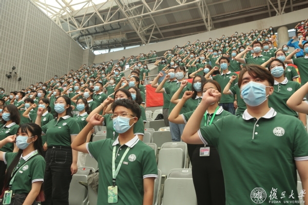 全场新生在学生会主席团成员陆泽天及研究生会主席团成员毛天婵的带领下向校旗庄严宣誓:“忠于祖国,热爱人民,探求真知,追求卓越,遵纪守法,明德立身,刻苦严谨,求实创新,博学笃志,切问近思,为民族复兴而学习,为探究真理而学习,为人类福祉而学习,恪守学术道德,弘扬复旦精神,为学校争光添彩,为国家贡献力量!”
