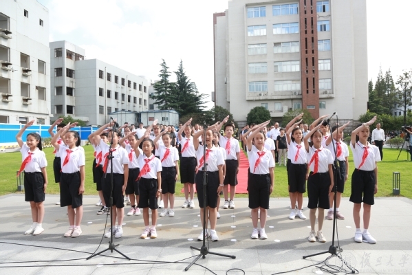 伴随着激昂的《义勇军进行曲》旋律,全场齐声高唱中华人民共和国国歌。唱毕,全场肃立,向为中国人民解放事业和共和国建设事业英勇献身的英雄先烈默哀。默哀毕,复旦附属学校学生代表唱起少年先锋队队歌《我们是共产主义接班人》。稚嫩齐整的歌声久久回荡在烈士雕塑和纪念广场。
