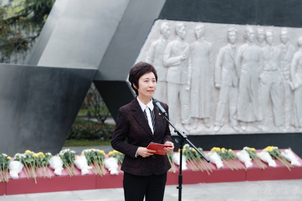 焦扬代表复旦大学全体师生员工,向为国捐躯的英雄先烈和到场的英烈家属致以崇高敬意,向对雕塑及广场落成做出重要贡献的复星公益基金会、上海美术设计有限公司表示衷心感谢。
