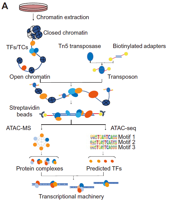 在本次发表的最新成果中,科研人员基于ATAC-seq技术,开发出直接富集和定量内源性染色质开放区域实时原位转录的转录蛋白机器的新方法ATAC-MS(图1)。该技术利用生物素化的高活性Tn5转座子,特异性结合染色质开放区暴露的DNA,将DNA片段化并进行生物素(biotin)标记。而后通过链霉亲和素偶联的磁珠与生物素化的DNA反应,分离纯化出DNA及DNA上结合的转录复合物。对上述复合物分别进行蛋白质酶解-肽段纯化与DNA纯化-文库构建,可用于平行的质谱鉴定与二代测序分析,由此可直接观测获得转录调控蛋白质机器信息及其结合序列motif信息。