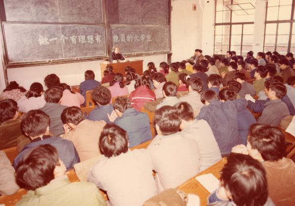 1983年,谢希德在大教室讲课:“做一个有理想有抱负的大学生”