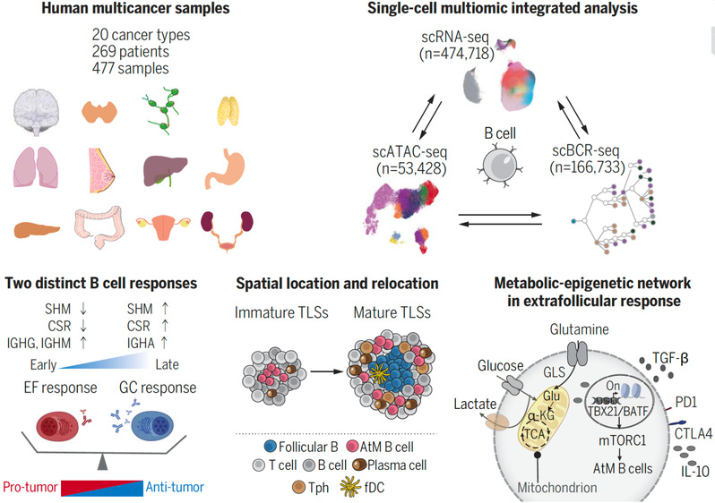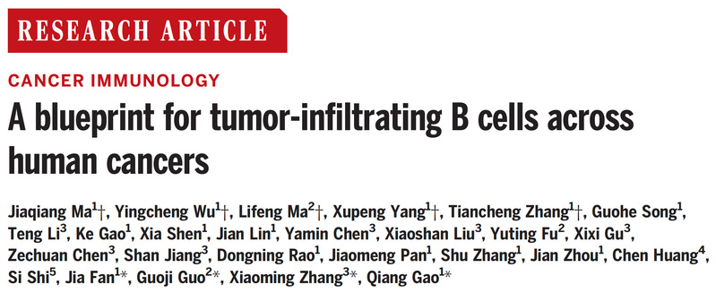 5月3日,复旦大学附属中山医院樊嘉院士、高强教授团队,联合中国科学院上海免疫与感染研究所与浙江大学基础医学院等合作单位,在《科学》(Science)杂志在线发表了题为《人类癌症中肿瘤浸润 B 细胞蓝图》(A blueprint for tumor-infiltrating B cells across human cancers)的论文,系统性揭示了肿瘤微环境B细胞的表型功能异质性、动态分化以及表观调控机制。研究团队分析了肝癌、胆管癌、胆囊癌等多个癌种的临床样本数据发现,B细胞可以分为15个不同功能的亚群。其中,一类叫做DUSP4+非典型记忆B细胞的亚群引起了研究团队的注意。这类细胞通过滤泡外应答途径分化为浆细胞,能够分泌识别自身抗原的抗体,并抑制T细胞的功能,导致肿瘤微环境处于免疫抑制状态,不利于患者的预后和抗癌免疫治疗。这一发现为未来精准调控B细胞、鉴定新的免疫治疗靶点以及开发新的免疫联合治疗方案提供了重要线索。