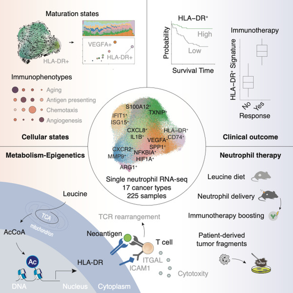 此外,该团队今年2月在《细胞》(Cell)杂志上发表的《中性粒细胞分析阐明抗肿瘤抗原呈递功效》(Neutrophil profiling illuminates anti-tumor antigen-presenting potency)论文中,进一步系统性揭示了中性粒细胞的抗肿瘤功能,探索了利用中性粒细胞的抗原提呈特征来增敏肿瘤免疫治疗的价值和临床意义。研究者同样利用来自肝癌、胆管癌、胆囊癌等多个癌种患者的样本来源的数据,发现一种特殊的中性粒细胞亚群(HLA-DR+CD74+),与患者的临床预后正相关,并能增强T细胞的抗原特异反应且促进形成有利于免疫治疗的热肿瘤微环境。研究团队还发现,饮食中富含的亮氨酸对中性粒细胞的抗原提呈功能有促进作用;富含亮氨酸的饮食或输注HLA-DR+CD74+亚群的中性粒细胞都能够增强PD-1单抗的肿瘤免疫治疗疗效。这提示我们未来可以通过饮食干预等方式来增强患者自身的抗肿瘤免疫力,提高免疫治疗疗效。这项研究为利用中性粒细胞抗原提呈来增敏免疫治疗提供了新的思路,有望推动肿瘤免疫治疗的进一步发展。