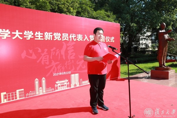 “我志愿加入中国共产党,拥护党的纲领,遵守党的章程……”在庆祝建党百年、习近平总书记给复旦大学重要回信精神一周年之际,6月22日下午,根据党中央安排,复旦大学党委组织大学生新党员代表举行入党宣誓仪式。校党委书记焦扬带领100名2021年大学生新党员在《共产党宣言》展示馆面对党旗庄严宣誓。