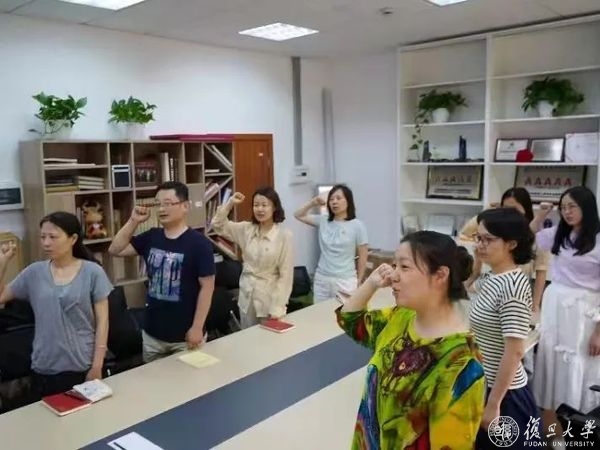 在悠扬的歌声中,在100位新入党党员接力下,一面党旗在内场缓缓展开。这面党旗在复旦飘扬了一百年,象征着共产党人的精神和力量,是复旦人的信仰和方向。在火红的党旗下,焦扬领誓,全场4600余名党员共同重温入党誓词: