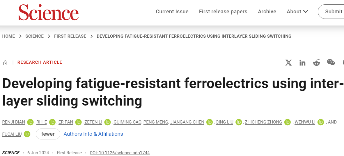 近日,复旦大学材料科学系/光电研究院李文武教授团队、电子科技大学刘富才教授团队以及中国科学院宁波材料所钟志诚研究员团队基于二维3R-MoS2滑移铁电材料,联合提出一种性能优异的抗疲劳铁电系统。2024年6月7日,相关研究成果以《抗疲劳滑移铁电体的发现》(“Developing fatigue-resistant ferroelectrics using interlayer sliding switching”)为题于《科学》(Science)主刊在线发表。该研究为解决铁电材料领域长期存在的疲劳问题提供了一种全新途径,有望推动该材料在铁电存储器及类脑智能芯片等方面应用。