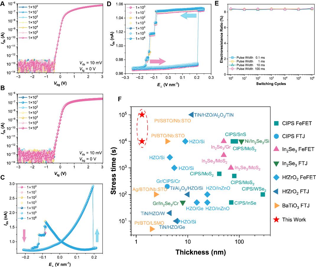 针对这一问题,联合研究团队发现新型的二维滑移铁电材料具有天然的耐疲劳特性。这是因为滑移铁电机制与传统铁电材料的离子位移机制有明显的不同,在电场的作用下,范德华层状材料的层与层之间会产生整体滑移,同时层间发生电荷转移,进而实现面外极化翻转。相比于常规铁电材料,滑移铁电通过层间滑移实现极化翻转所需电场较小,如此小的电场不足以使带电缺陷移动。另外,由于二维材料层状结构,缺陷难以跨越层间进行移动,因此缺陷很难聚集团簇,也不会产生铁电疲劳。