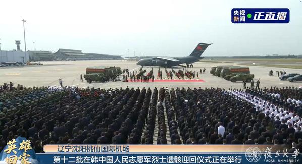 青山忠骨,英雄回家。9月12日至13日,第十二批30位在韩中国人民志愿军烈士遗骸及相关遗物由空军运-20专机接运回国,在沈阳桃仙国际机场庄严迎回,并隆重安葬于沈阳抗美援朝烈士陵园。至此,已有1011位志愿军烈士遗骸回归故土。
