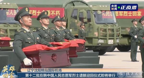 此次复旦大学代表团由法医学与法庭科学学院院长李成涛带队,包括法庭科学研究院副院长黄平,博士生魏麒、郭小凡,本科生郭晓勇、陶静如、宁津成。他们不仅参与迎回仪式,还于12日下午瞻仰沈阳抗美援朝烈士陵园,并于13日上午出席安葬仪式。