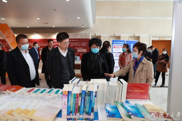 在逸夫科技楼,翁铁慧视察了复旦教材建设展、“两大工程”成果展。据副校长徐雷介绍,复旦大学荣获全国优秀教材奖项共25项,新闻学院荣获“全国教材建设先进集体”称号,学校中国语言文学系陈思和教授获“全国教材建设先进个人”称号。学校参编“马工程”教材20本,其中已出版15本。9月,“复旦大学上海医学院人文医学核心课程系列教程”9本出版完成。