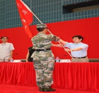 在会上,陈立民副书记向26个连队授旗并作动员讲话。他讲述了军训的法律依据和战略意义,明确了学生军训的重要性和必要性。在分析了当前我国所面临的安全形势后,他指出,当代大学生要注重国家安全意识的培养和自身意志品质的锻炼。军训是一次能够全面提升学生国防意识和磨练学生意志的实践,对个人、对国家都有十分深远的意义。他希望参训学生树立集体主义精神,将组织性、纪律性铭记在心,团结友爱、互帮互助,勤奋学习军事知识,增强国家安全意识,经受住军训的考验。
