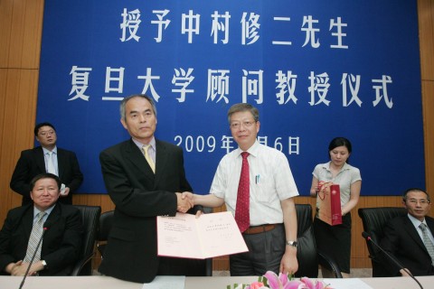 新闻中心讯 7月6日晚,我校在逸夫科技楼举行受聘仪式,聘任加利福尼亚大学教授Shuji Nakamura(中村修二)为复旦大学顾问教授。校长杨玉良向中村修二教授颁发了复旦大学聘书,上海市科委主任寿子琪代表上海半导体照明工程技术研究中心理事会向中村修二先生颁发顾问聘书。科技部副部长曹健林到会祝贺并讲话。