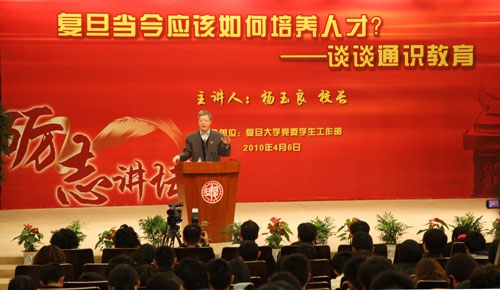 2010年4月6日下午,光华楼东辅楼吴文政报告厅座无虚席,所有听众的目光都注视着本次砺志讲坛的嘉宾——复旦大学校长杨玉良院士。杨校长上任后,承诺每年为学生作一次讲座。继去年他为学生作了坚持理想主义的“笃志”演讲后,今年又围绕“博学”主题,与学生畅谈通识教育和人才培养。