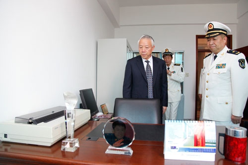 在舰艇学院政治系,秦绍德一行来到方永刚的办公室参观。办公室布置井然,绿色植物使整个房间生气盎然,办公桌上整齐摆放着日历牌、茶杯和肖像相框,书橱里是政治学最新参考书目,房间里的一切都保持着方永刚当年的布置。