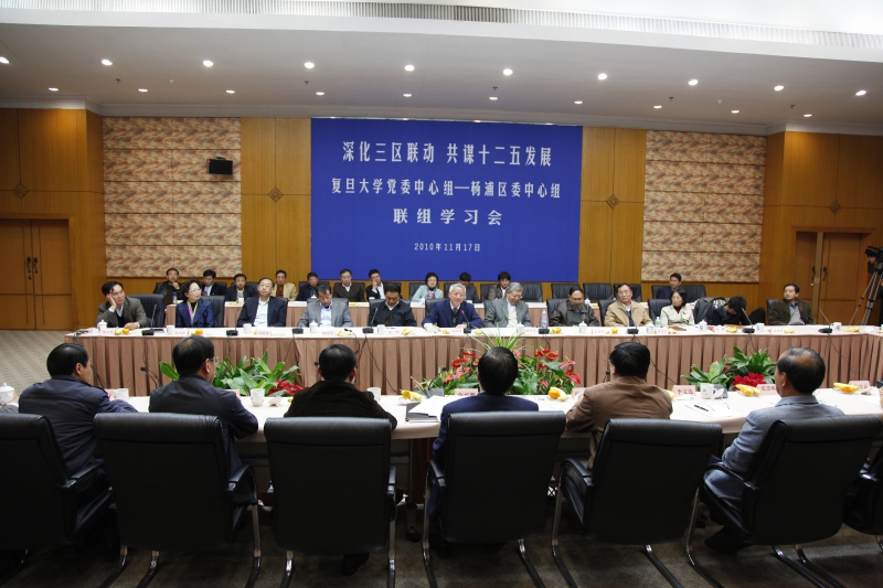 11月17日,复旦大学党委与杨浦区委中心组联组学习会在我校逸夫科技楼举行。本次学习会的主题为“深化三区联动,共谋十二五发展”。校党委书记秦绍德,校长杨玉良,常务副校长张一华、王卫平,副校长陈晓漫、桂永浩,部分院系、附属医院和机关部处的负责同志参加。杨浦区委书记陈寅,区委副书记、区长金兴明等区委中心组成员参加本次学习会。会议由张一华主持。
