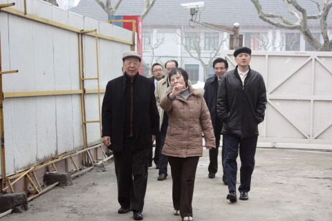 吕志和校董一行首先参观了即将完工的复旦大学吕志和楼(子彬院)。基建处处长姜佩珍向吕志和校董一行介绍了该楼的修缮进程。