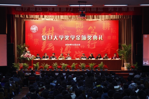 2010年12月23日下午,以“耕耘、博学、笃行、奉献”为主题的复旦大学2009—2010学年奖学金颁奖典礼在相辉堂隆重举行。复旦大学校长杨玉良院士,复旦大学党委副书记、校奖(助)学金评审委员会主任陈立民,复旦大学副校长、复旦大学教育发展基金会秘书长许征,校奖(助)学金评审委员会委员,以及13家来自校外设奖单位和个人的代表、各院系副书记及辅导员老师、获奖学生共900余人齐聚相辉堂,共同经历这一隆重而又难忘的典礼。典礼由校党委学生工作部部长许玫主持。