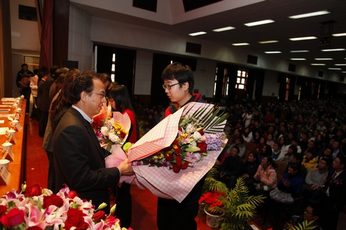 今年,我校共有13000多名学生获得各级各类奖学金,共计4000余万元。此外,本学年校外单位和个人在我校共设立奖学金57项,获奖学生993名,总奖金额400余万元。在今天的颁奖典礼上,13家校外设奖单位和个人的代表亲自为获奖学生颁发了奖学金证书,获奖学生现场向设奖单位的嘉宾们献上鲜花,并赠送了由他们亲手制作的礼物,表达同学们的心意和感恩之情。嘉宾们也动情地表达了他们将继续支持我校教育事业的决心,同时他们还亲切寄语获奖学生要再接再厉、不断进取,今后以己所能回报学校,回报社会。