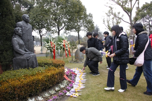 祭扫仪式后,全体人员还参观了福寿园人文博物馆陈望道专区。据悉,本次祭扫活动是复旦大学纪念陈望道先生诞辰120周年系列活动的序幕,在今年5月复旦大学106周年校庆期间,还将有相关纪念活动。 近日,外文学院10级硕士生党支部以“追思教育巨擘,畅谈《宣言》感悟”为主题,在曦园陈望道老校长的铜像前开展了一场别开生面的主题党日活动。研究生邓小平理论研究会和中文系研究生团学联也联合组织了《共产党宣言》解读暨陈望道先生诞辰120周年纪念活动。