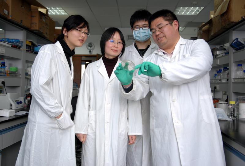 论文第一作者赵世民教授(右一)、第二作者雷群英教授(右三)和研究团队成员在实验室