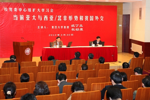 新闻中心讯 3月30日,校党委中心组举行扩大学习会,邀请我校国际问题研究院沈丁立教授、杜幼康教授就当前亚太与西亚/北非形势和我国外交做辅导报告。校党委副书记陈立民主持学习会。