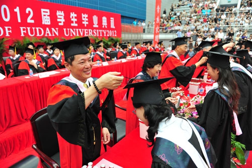 学位授予仪式庄严而肃穆。学士帽上的流苏从右边拨到了左边,这是一种荣耀,更是一种鞭策。2012届毕业生中不乏杰出的佼佼者,他们分别在学术,实践、文体等领域取得了一定的成绩。校党委副书记陈立民,在毕业典礼上宣布了“毕业生之星”的名单,并为他们颁发证书。上海医学院基础医学专业毕业生刘晔代表毕业生发言,抒发了对母校的依依不舍和深深爱意,也表达了全体毕业学生的承诺,将把复旦赠予的财富带出校园、奉献社会,一辈子努力做一个善良的人、自信的人和有追求的人。
