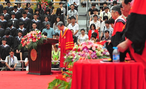 校长杨玉良代表学校向所有毕业生表示热烈的祝贺,并在阵阵热烈的掌声中发表了精彩演讲。他寄语2012届毕业生,要成为知识分子,除了知识以外,应该还有智慧,有自我反思的能力,能够对自己、对社会、对自己的学科或者对其它的学科,对各种各样的知识都能够进行反思;应该还有德性,敬畏真理与自然,尊重他人与包括自己在内的所有生命。他希望毕业生远行的步伐能够更加踏实,摆脱一些世俗的怨恨和羡慕,并祝福毕业生在未来的人生道路上,能够精彩,能够辉煌,但同时也是平凡的。