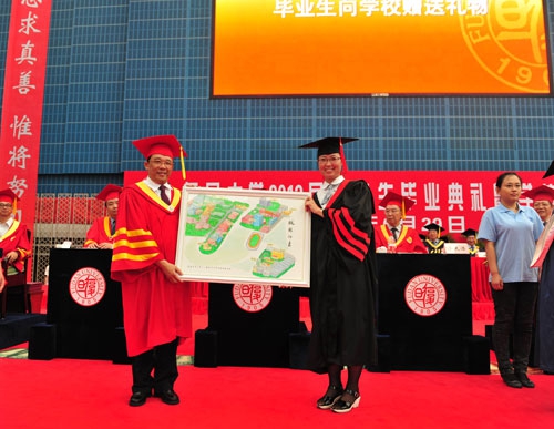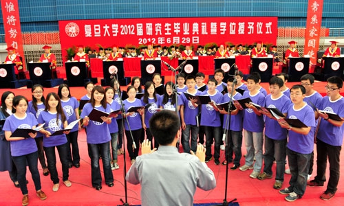 毕业研究生代表将四幅精心绘制的复旦大学手绘地图献给母校,表达了毕业生们对母校感恩之情与深深眷恋。在典礼的最后,全体毕业研究生齐唱校歌,为2012届研究生毕业典礼画上了圆满的句号。