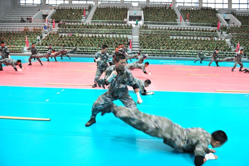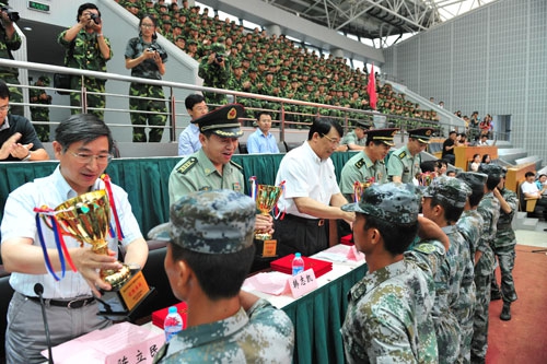 其后,参训学生代表和七三〇三一部队教导队官兵分别进行了军体拳和擒敌拳表演,他们精彩的表现引来现场阵阵掌声。接着,校武装部副部长、军训团参谋长黄荣国宣读了军训团嘉奖令,与会领导为获奖连队和个人颁奖。参训学生代表还向教官赠送了精心制作的军训文化衫,表达对教官的感激之情。