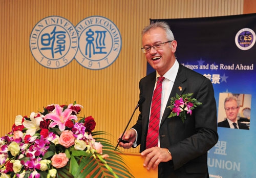 讲座中,布提先生从历史的视角回顾了欧元产生的背景,介绍了经济与货币联盟的预期收益与代价,并用翔实的数据和图表展示了欧元现钞发行10年来取得的成绩。随后布提先生深入浅出地分析了欧洲主权债务危机发生的导火索以及欧元区深层次的政策挑战,并提出了结束欧元区反向经济恶性循环的综合性危机应对策略:通过银行联盟、财政欧盟、经济结构调整等措施促使欧盟各国从碎片化到一体化的转变,促进脆弱国家经济的发展,结束恶性循环,从而走向真正的经济与货币联盟。会场气氛活跃,讲座最后,面对同学们关于欧洲央行角色转变、欧元区救助机制、欧元区信心重塑、中欧贸易等多方面的踊跃提问,布提先生以专业的视角做了认真细致地回答,与在场同学亲切互动。上午12时,讲座在热烈的掌声中圆满结束。陪同前来和出席讲座的还有欧洲委员会经济与金融事务总司国际处处长海兹•雪莱(Heinz Scherrer)、欧盟驻华代表团新闻处处长峰威力( William Fingleton )、保加利亚领馆的总领事白爱玲(Irina Beleva)等。