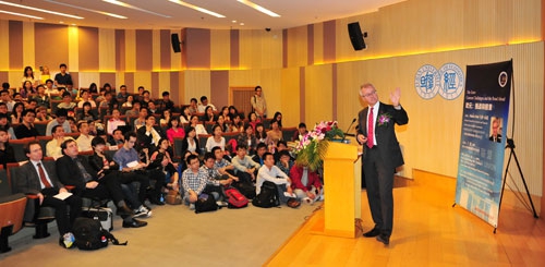 上午10时,马可•布提先生在经济学院大金报告厅做了题为“欧元:挑战与前景”(The Euro:Current Challenges and the Road Ahead)的主题演讲。大金报告厅座无虚席,原来定额200余人的大金报告厅挤满了300余名来自复旦和其他院校的师生以及中外媒体记者。复旦大学欧洲问题研究院中心主任丁纯教授主持本次讲座。复旦大学林尚立副校长和中国人民银行上海总部国际处处长冯润祥先生出席会议并致辞。