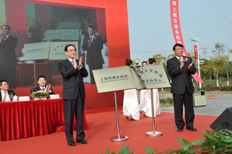 庆典仪式上,市委常委、浦东新区区委书记徐麟和复旦大学党委书记朱之文共同为上海市浦东医院、复旦大学附属浦东医院(筹)揭牌。浦东医院名誉院长张文康作重要讲话。市卫生局副局长瞿介明,复旦大学副校长陆昉,浦东新区副区长谢毓敏,华山医院院长丁强、浦东医院院长余波在会上致辞。其中,陆昉副校长表示在过去近一年里,复旦大学根据与新区政府签订的合作协议,在医疗、教学、科研、管理等方面给予原南汇中心医院很大的支持,今后,将继续与新区政府共同推动浦东医院的发展,帮助其加快创建三级综合性医院的步伐,并力争将其正式建成复旦大学附属医院(非直属),同时希望浦东医院珍惜机遇,全面提升医院各项工作。