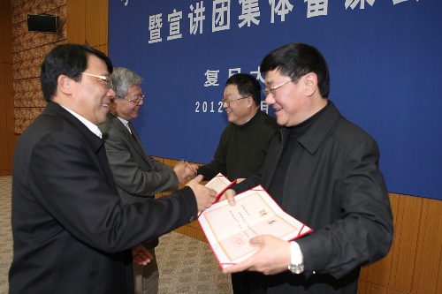 新闻中心讯 11月19日,党的十八大精神专家座谈会暨我校十八大精神宣讲团首次集体备课会在逸夫科技楼举行。两位宣讲团团长,校党委书记朱之文和校长杨玉良出席了当天的座谈会,并为宣讲团团员颁发聘书。