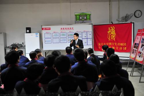 当天下午4点,在市级文明单位上海柴油机股份公司的生产车间,哲学学院硕士生葛骏亚为公司的一线工人带来了一场题为“阳光路上——科学发展观十年”的讲座。他从近日引起热议的央视“你幸福吗”的调查巧妙地引出讲座主题,通过鲜活的事例、可信的数据,以平实、风趣的语言生动地将科学发展观的提出背景、理论内涵、发展历程、贯彻落实等重要问题娓娓道来。讲座反响热烈,有工人表示,“别看讲师虽然不是专家教授,但理论问题吃得透,把握得准,讲得活”。还有工人师傅表示,“研究生们的讲座,贴近生活,都是大实话、大白话,简明易懂。复旦学生们平易近人,有幽默感,不会让人对理论问题产生距离感”。