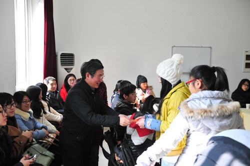 除此之外,今年学校还为家庭经济困难学生准备了丰盛的文化“套餐”,如 “鸿雁传情 师道爱怀”慰问信发放活动、“温馨祝福 空中传情”感恩主题教育活动、“欢声笑语 共同分享”贺岁电影观摩活动。每一位家庭经济困难学生都会收到一封来自辅导员或导师的信和一条新年祝福短信,以鼓励学生自强不息、克服困难、心怀感恩。寒假期间,学校将统一安排留校过年的家庭经济困难学生及家在上海的经济困难学生观摩贺岁新片,放松心情,陶冶情操。