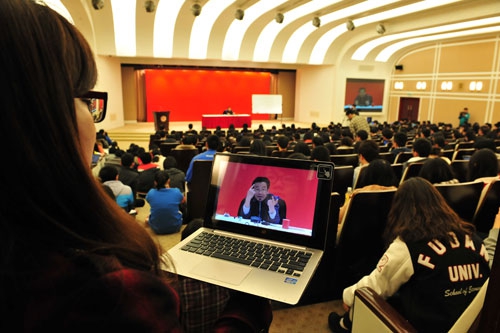3月5日晚,共享课程中的明星课程之一——由被学生誉为“哲学王子”复旦大学哲学学院王德峰教授主讲,来自复旦大学的胡志辉、陈果、上海海洋大学曾誉铭、华东师范大学蔡剑锋、上海工程技术大学孙晓艳、上海杉达学院严国军、上海商学院姚朝华等共7位学者共同执教的《哲学导论》正式开讲。当天,500余名来自上海各所高校的学生赴复旦大学光华楼教学现场聆听王德峰老师的讲课,而其他选课同学可以通过登录上海高校课程中心网站同步收看授课实况。