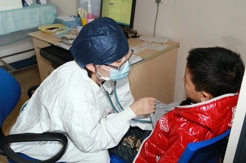 儿科医院发热门诊医生在诊治患儿。 摄/连健雄