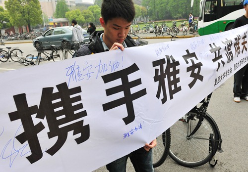 当天中午和晚上,众多复旦大学的师生及员工纷纷解囊相助,为地震灾区的人民奉献了自己的心意。在募捐现场,“心系雅安,祈福平安”、“雅安不孤单,我们在你身边”等横幅格外显眼。