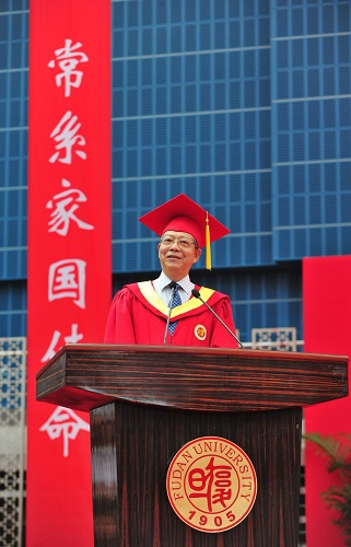当天,按照复旦一贯的传统,在主席台第一排就坐依然是部分来自文、理、医各个学科的知名学者、教学名师代表。主席台两侧,高悬着毕业对联:“绚丽青春,博学笃志践真理,常系国家;闪亮人生,切问近思求真善,惟将努力”。典礼由常务副校长陈晓漫主持。