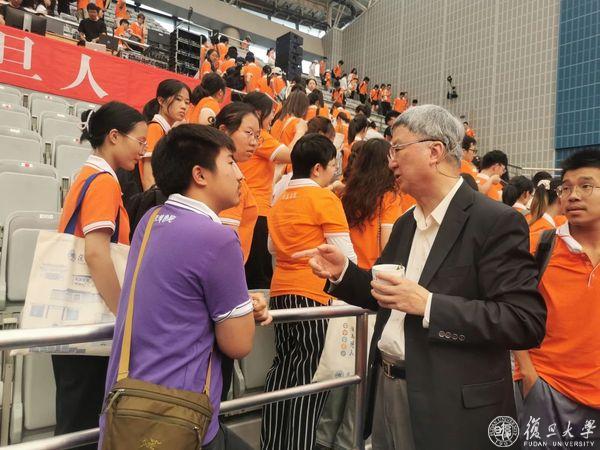 “亲爱的学弟学妹们,欢迎成为复旦人!”课程结束后,现场同学们给这位与复旦结缘46年的老学长,献上热烈的掌声。而站在讲坛中心的朱民,朝着大家鞠了三躬。一堂两小时的课程,朱民全程站立讲完,字句铿锵有力、幽默风趣。在与同学们的互动间,朱民展现了一位复旦老学长对复旦新生的期许和关爱。