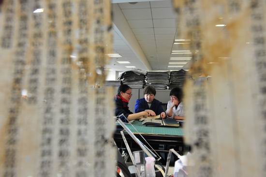 1、古籍修复师黄正仪老师向她的两个新徒弟传授古籍修复技艺。校刊去年报道了黄正仪老师以纯手工方式修复古籍后继无人,今年有两位年轻人加入了黄老师古籍修复的行列。