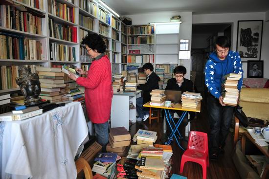 3、3月22日,作为朱维铮先生周年祭学术活动的一部分,《怀真集》发行仪式暨朱维铮先生藏书捐赠仪式在历史系举行。仪式上,朱维铮先生妻子王桂芬女士根据朱先生生前嘱托将先生所藏2万多册书籍全部捐献给学校,在历史系资料室建立“朱维铮书库”,供全校师生使用。图为王桂芬女士与历史系同学在家中书房对藏书进行分类、编目、装箱。